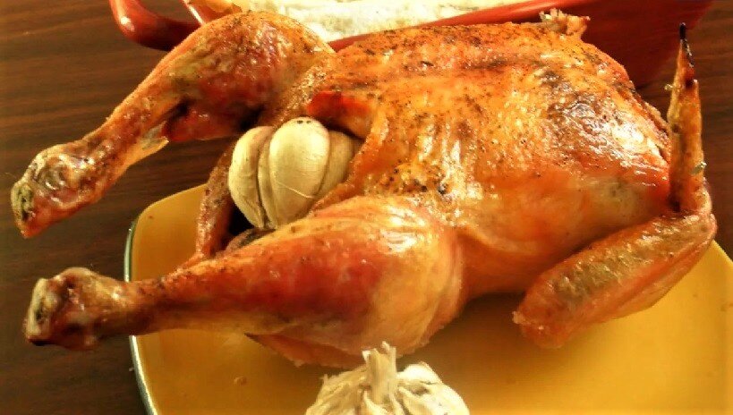 На этом можно ограничиться и отправить курицу в духовку. Но есть вариант придать блюду дополнительный аромат. Для этого поместите внутрь тушки головку чеснока, очищенную от верхней грубой шелухи, или один лимон.