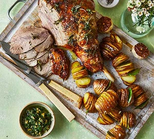 Шаг 2 Нагрейте духовку до 210С/190С Вентилятор/Газ 7. поместите каждую картофелину между ручками двух деревянных ложек и разрежьте по ширине с интервалом в 3 мм – ручки ложек остановят вас от нарезки насквозь. Вставьте лавровый лист в среднюю щель каждой картофелины. Опрокиньте картофель в большую жаровню с половинкой луковицы чеснока и оставшимся розмарином и тимьяном. Сбрызните половину масла и приправьте, затем бросьте, чтобы покрыть и перевернуть картофель так, чтобы он был разрезан стороной вверх. Положите баранину в середину банки, вытолкнув картофель наружу, затем натрите баранину оставшимся маслом и лимонным соком и щедро приправьте.