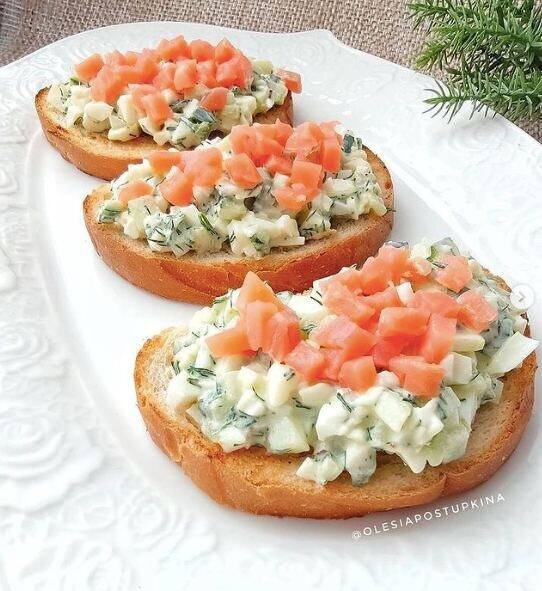 🥖Выложить салат на хлеб, сверху украсить кусочками сёмги.