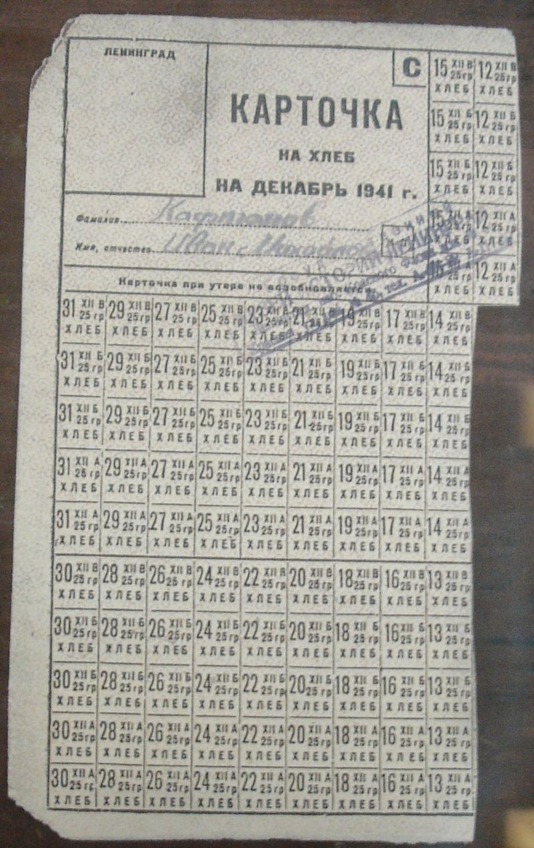 Выпуск товаров по карточкам был введен в Ленинграде 18 июля 1941 года. В период блокады ленинградцы получали хлеб по карточкам ежедневно, а остальную еду - каждые десять дней (один раз в десять дней). Начиная с сентября, нормы питания как для военнослужащих, так и для гражданского населения регулярно снижались и были минимальными с 20 ноября по 25 декабря 1941 г., после чего ситуация с нормами питания стала улучшаться. В ноябре - декабре 1941 г. 34,4% населения города питалось по норме питания рабочего, 29,5% - по норме для иждивенца, 18,6% - по детскому и 17,5% - по норме питания для служащих. Хлеб для блокады был основным продуктом питания. Несмотря на то, что другие продукты выдавались по карточке, они составляли гораздо меньшую часть в рационе и выдавались с перерывами.
