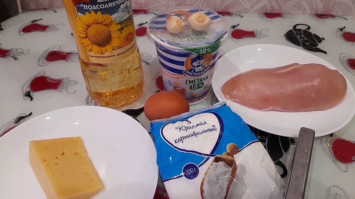 Сыр и куриное филе режем на маленькие кубики. В миску вбиваем яйцо, добавляем крахмал, сметану, укроп, выдавливаем чеснок и солим по вкусу.