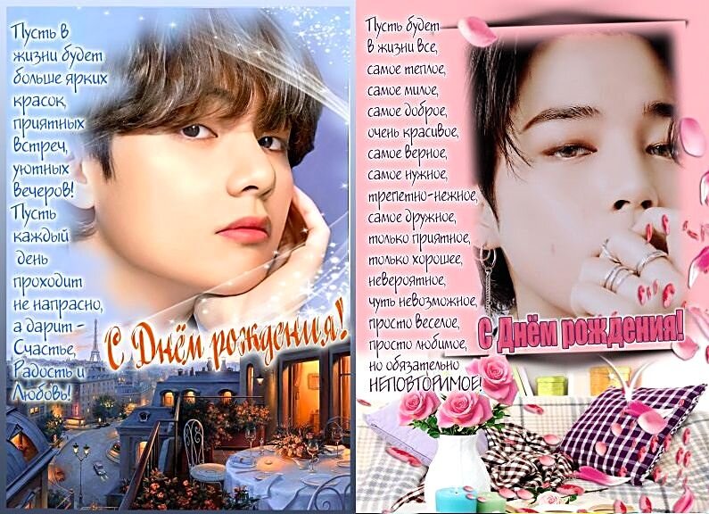 А пока что, я решила создать поздравительные открытки с парнями из BTS, с пожеланиями на русском языке, подобрав, на мой взгляд, подходящие фотографии и пожелания. Больше всего открыток, шесть штук, получилось с Тэ Хёном, моим любимым биасом, но и про остальных парней я не забыла.