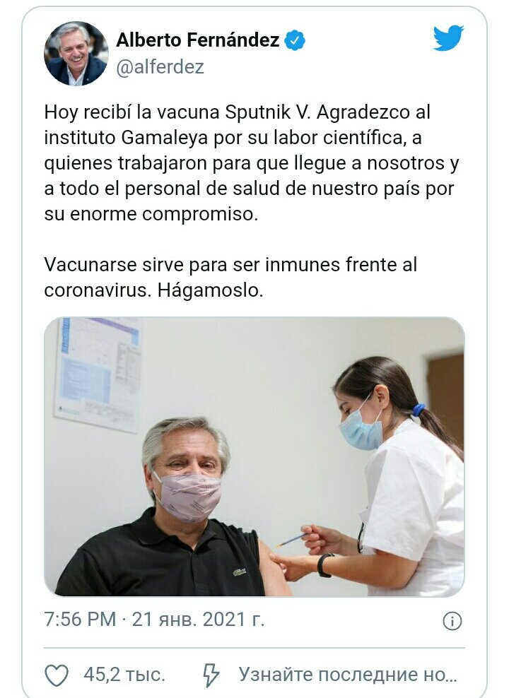 Никто не ожидал подвоха со стороны президента Аргентины. Добрый дядечка мужественно привился российской вакциной "Спутник-V" ещё в январе. Ну и здорово! Ну и хорошо!