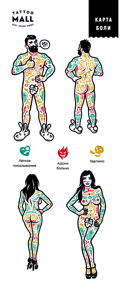 Как известно, красота требует жертв, и татуировка не исключение. Однако желание получить максимум комфорта от процесса остается одним из самых важных для клиента. Действительно, эта процедура — не из приятных, и она доставляет определенные сложности вне зависимости от пола и возраста человека. Существует так называемая карта боли, которая иллюстрирует самые болезненные и относительно неприятные области для нанесения рисунка.