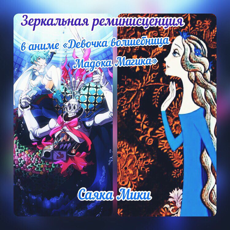 Трагическая сказка о Русалочке экранизировалась множество раз, а также цитировалась в других произведениях, ведь трудно остаться равнодушным к такой искренней и жертвенной любви. Цитировалась она и в аниме, примером может послужить грустная история любви Мики Саяки из «Девочка волшебница Мадока Магика»…Однако, здесь это скорее пример зеркальной реминисценции отчасти. Сейчас постараюсь объяснить почему. Что же такое реминисценция?