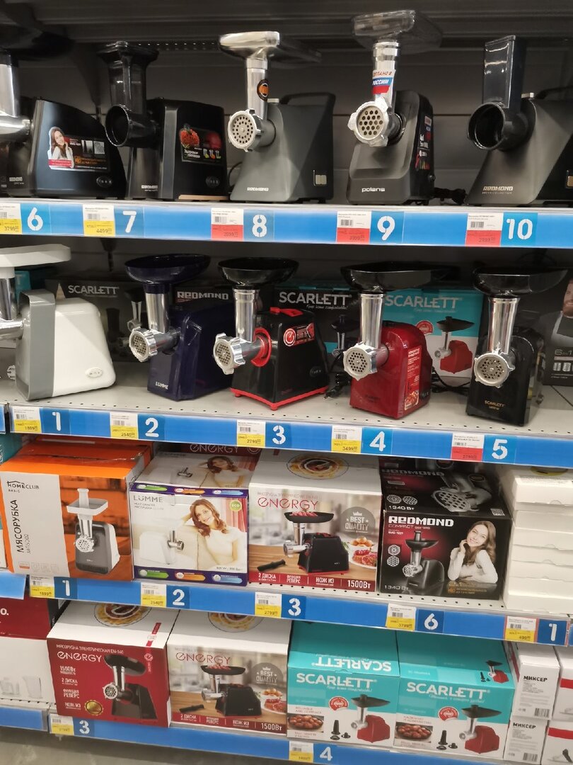 Здесь у нас мясорубки, которых, кстати, совсем не мало. А скидка есть на три разных бренда: за 2799 рублей вместо 5262 можно купить от "Scarlett", за 2999 вместо 6314 от "Redmond" и за 3999 вместо 5780 от "Polaris". Очевидно, что первые два варианта самые выгодные.
