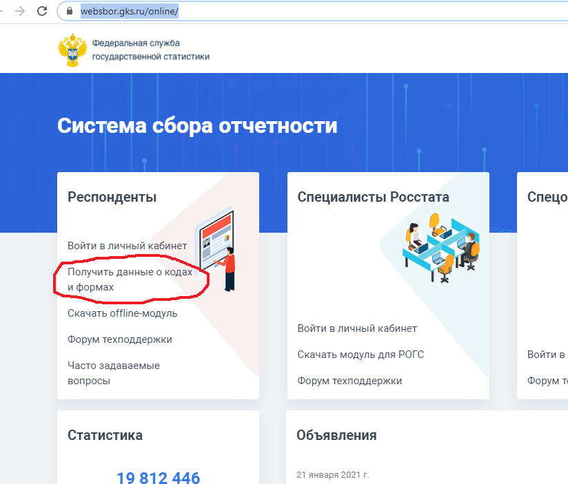 Сервис находиться по адресу https://websbor.gks.ru/online/. Жмем получить данные о кода и формах: