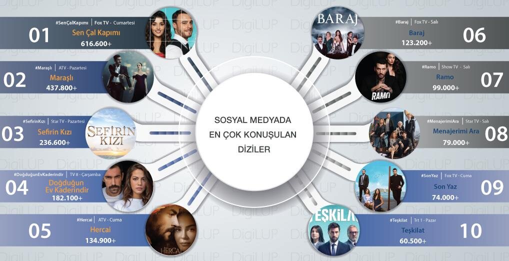 Согласно данным Digilup, на прошлой неделе самое большое внимание пользователей социальных сетей привлекли именно эти десять турецких сериалов: