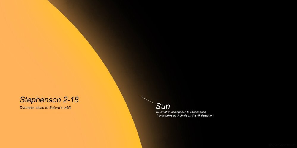 В 2020 году астрономы выявили в ходе долгих исследований самую большую на данный момент звезду в видимой Вселенной – это красный гипергигант Стивенсон 2-18. По показателю размеров и объёмности он оставил далеко позади себя таких признанных астрономических гигантов, как VV Цефея, NML Лебедя, UY Щита, VY Большого Пса и других им подобных.
