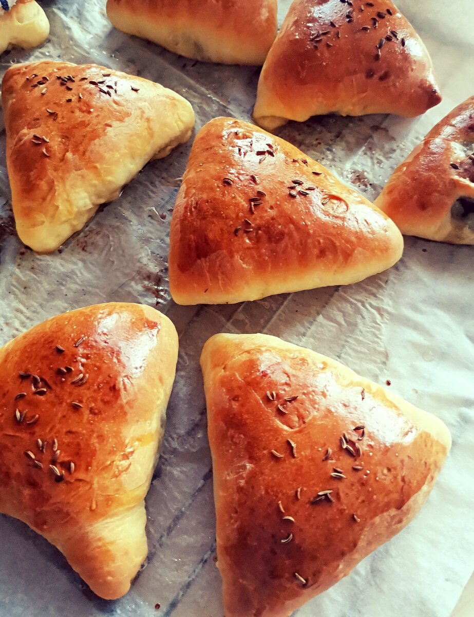 Такое тесто я первый раз держала в руках🤲 Эчпочмак - рецепт татарских пирожков треугольной формы (название переводится с татарского языка как "треугольник") с начинкой из мяса, картофеля и лука. Приготовление ⬇️ Начинаем с приготовления теста: Сливочное масло растопите и оставьте, чтобы оно немного остыло. Молоко подогрейте, чтобы оно было чуть тёплым. В тёплое молоко всыпьте сахар и дрожжи. Размешайте и оставьте на 15 минут. В отдельной маленькой посуде разболтайте яйцо с солью и растительным маслом. В глубокую миску для замеса теста влейте молоко с дрожжами, взбитое яйцо и тёплое растопленное сливочное масло. Просеиваем муку и замешиваем тесто. Хорошо вымешиваем и оставляем в теплом месте. Для начинки соединяем фарш,(можно добавить мелко нарезанный картофель), лук, соль, перец. Отдохнувшее тесто делим на 15 частей, добавляем начинку и формируем треугольники. Смазываем желтком с добавлением молока, посыпаем тмином. Отправляем в разогретую духовку до 180° примерно на 40-45мин.
