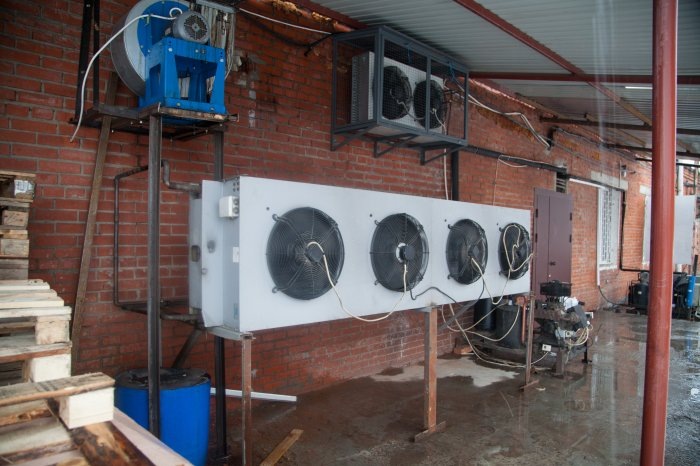 Далее производится сам монтаж с учетом всех расчетов и параметров, который включает следующее: монтаж компрессорного отделения; монтаж воздухоохладителей, конденсаторов; монтаж дренажной системы; подключение электрокабелей и т. д.