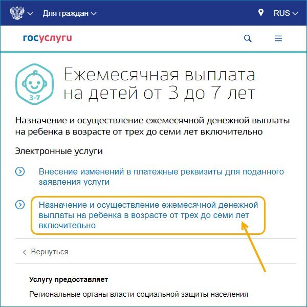 Такая возможность доступна для всех пользователей портала Госуслуг с подтвержденной учетной записью. Чтобы подать заявление, одному из родителей (попечителей) ребенка нужно зайти на портал и открыть услугу «Ежемесячная выплата на детей от 3 до 7 лет» . Далее нужно выбрать второй пункт из списка — «Назначение и осуществление ежемесячной денежной выплаты на ребенка в возрасте от 3 до 7 лет включительно» .