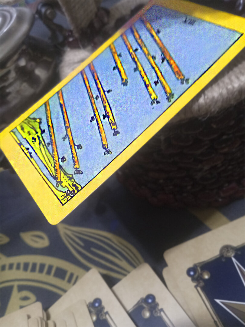 Все в этой карте говорит о движении, от восьми жезлов, летящих по воздуху, до листьев на них, прорастающих и развивающихся на ветру. Чистое небо за жезлами показывает, что сейчас ваш путь полностью открыт, и вы вольны идти куда хотите и делать что захотите. Восемь Жезлов, замечательная карта о большой энергии и мотивации.