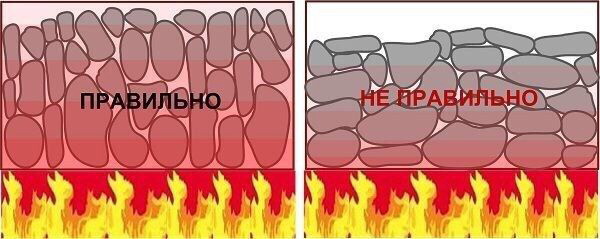 Камни для каменки перед укладкой нужно хорошо промыть и высушить на воздухе. Сухие валуны укладываем по принципу: самые