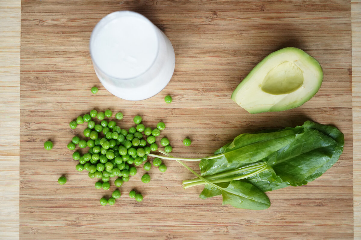 Кокосовое «молоко», щавель и щепотку соли взбиваем в блендере до однородности. Авокадо режем кубиками, лук мелко шинкуем. В миске смешиваем авокадо и горошек, заливаем зелёным кокосовым «молоком», по желанию посыпаем чили порошком и зелёным луком.