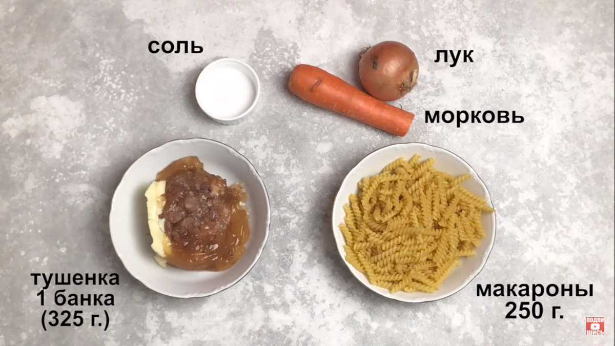 Макароны с тушенкой на сковороде это просто! Нужно подготовить продукты: тушенку используем говяжью, макароны - не имеет значения, подойдут именно те, которые возьмёте, морковь хорошо мытая и обсушенная салфеткой.