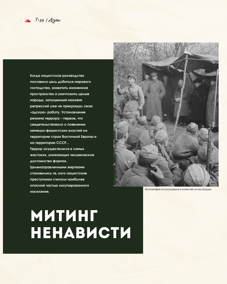Август 1942 года. В районе подразделений 19-й армии Карельского фронта. На деревьях, столбах, камнях — всюду, куда не посмотришь — плакаты, лозунги. На большом полотнище бойцы рассматривают картину страшных гитлеровских зл*деяний. В ярме из*ученные женщина и седой старик. Сбоку к повозке привязан маленький мальчик. Они, вместо лошади, тянут повозку, на которой сидит кр*вавый немец и плетью подгоняет своих рабов. А вот, как живая, с плаката смотрит девушка, красивая русская девушка. Молоденькая с черными глазами. Лицо ее из*родовано гитлеровскими п*лачами. Девушка закована_в железные цепи. Она просит бойца: «Освободи меня, уб*й_немца!» «Боец! Ты не дашь любимую на позор и бесчестие_гитлеровским солдатам!» — призывает плакат. В касках, с винтовками, прямо с переднего края, из окопов пришли сюда бойцы и командиры. У многих на груди красуются ордена и медали. Они собрались на митинг ненависти. Митинг превратился в демонстрацию кипучей ненависти к врагу. Отомстим гитлеровцам! Как один, зву