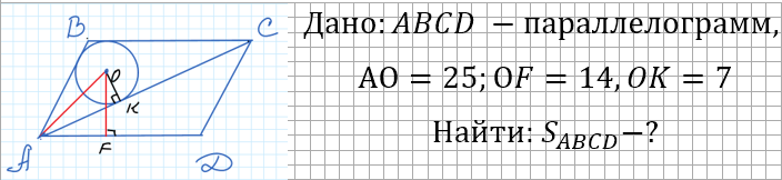 Задача: В параллелограмме ABCD проведена диагональ AC. Точка O является центром окружности, вписанной в треугольник ABC. Расстояния от точки O до точки A и прямых AD и AC соответственно равны 25, 14 и 7. Найдите площадь параллелограмма ABCD
