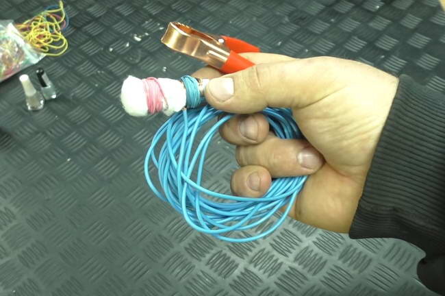На конец батарейки накладываем ватный томпон и также фиксируем резинкой.