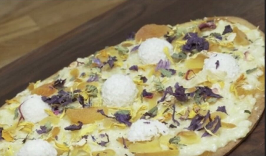 Масса: Нагрейте сливки и растопите белый шоколад. Добавляем фишки. Остужаем. На остывшее дно выложить варенье, а на варенье шоколадную массу. Сверху разложить по желанию половинки абрикосов и рафаэлло и присыпать лепестками цветов. Приятного аппетита!