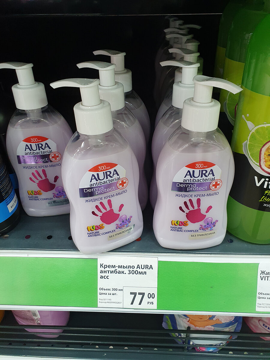 И первый товар в сегодняшнем обзоре – антибактериальное жидкое крем мыло AURA для детей, о чем сообщает надпись на бутылочке и забавный осьминог. Объем бутылочки – 300 мл. Стоимость жидкого мыла – 77 рублей. 👌