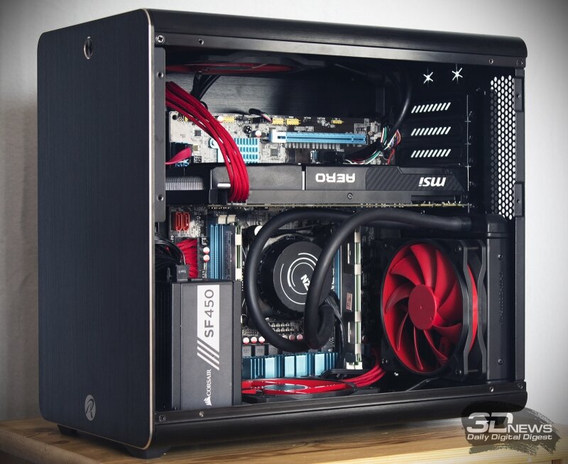 Сразу же бросается в глаза неудачная разводка некоторых компонентов. Неудобно разведен внутренний разъем USB 3.0. А установка длинной видеокарты, оснащенной двухслотовой системой охлаждения, приведет к перекрытию ближнего к ней PCI Express x1 и двух разъемов SATA 3 Гбит/с.