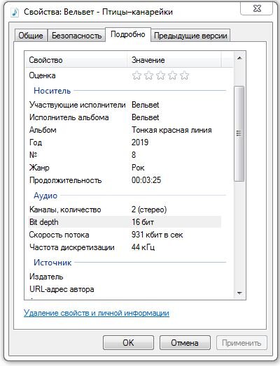 Для примера, возьмём композицию группы Вельвеt - Птицы-канарейки в формате flac 931 кб/с, 16 бит, 44.1 к Гц.