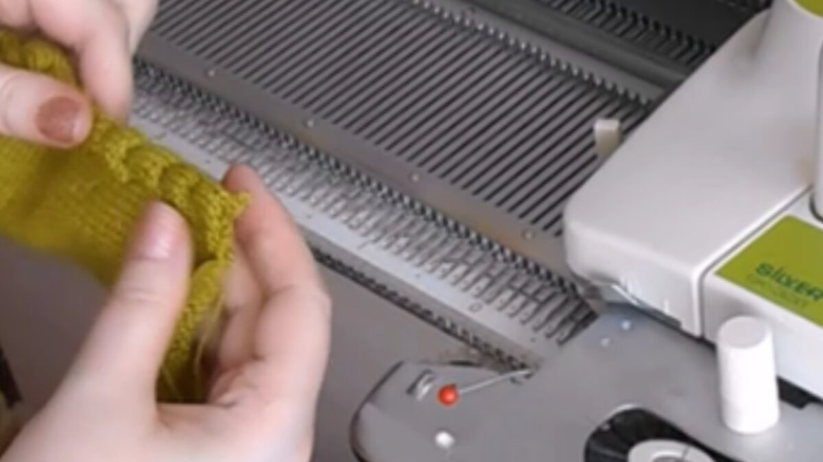Полотно поворачиваем изнанкой к себе. Деккером поддеваем три межузелковые протяжки по краю полотна, надеваем протяжки на три иглы слева, провязываем 10 рядов. (Количество рядов по вашему желанию).