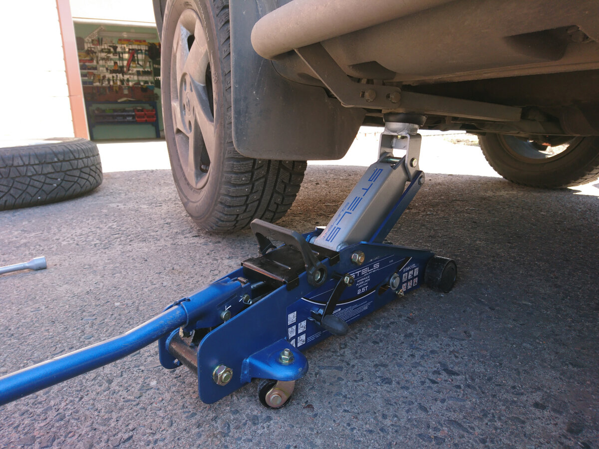 Через 3 сезона понял, что пора бы обзавестись чем-то более серьезным, так как и мелким обслуживанием периодически занимаюсь сам (колодки, что-то простое по подвеске, та же сезонная смена колес). Выбор очевидный – нужен подкатной домкрат, это быстро, удобно, в теории можно поднимать сразу борт целиком.