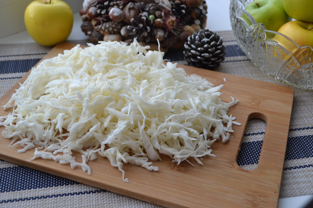Капусту необходимо тоненько нашинковать, можно с помощью комбайна.