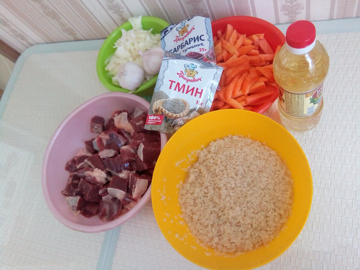 Ингредиенты для приготовления: говядина - 1 кг, морковь - 0,5 кг, лук репчатый - 0,5 кг, рис пропаренный - 0,5 кг, чеснок - 2 головки, масло растительное - 0,3 л, барбарис, тмин, соль.
