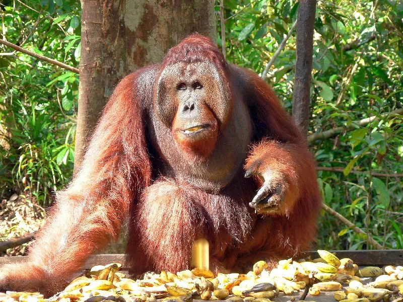 Найденные только на острове Борнео, Борнские орангутаны ( Pongo pygmaeus ) имеют более широкое лицо и более короткую бороду, чем их кузены, суматранские орангутаны. В июле этого года МСОП изменил их статус на критическую угрозу, поскольку с 1950 года количество их сократилось на 60%, и, согласно новым прогнозам, их число уменьшится на 22% к 2025 году .