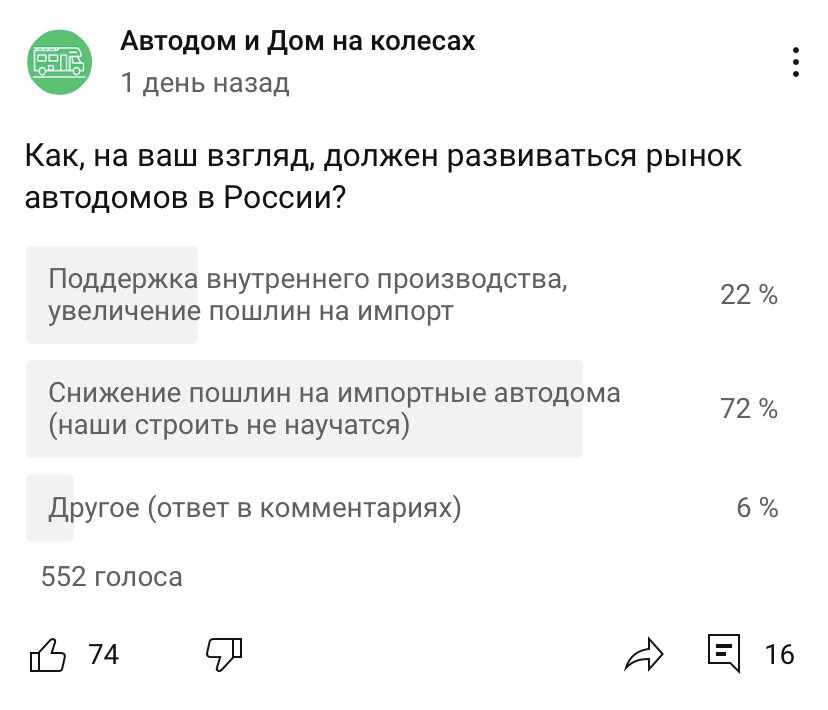 Мы задали вопрос подписчикам канала по теме ввозных пошлин на автодома.
