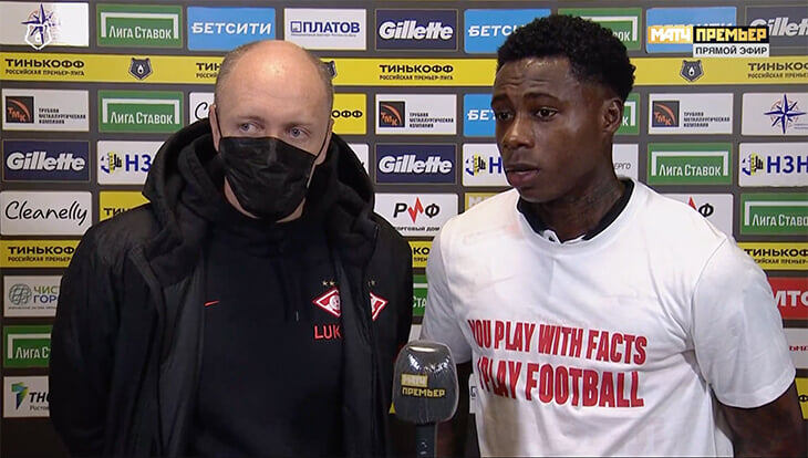 В перерыве матча «Ростов» – «Спартак» он пришел на флэш-интервью в специальной футболке с простым текстом красным по белому: You play with facts. I play