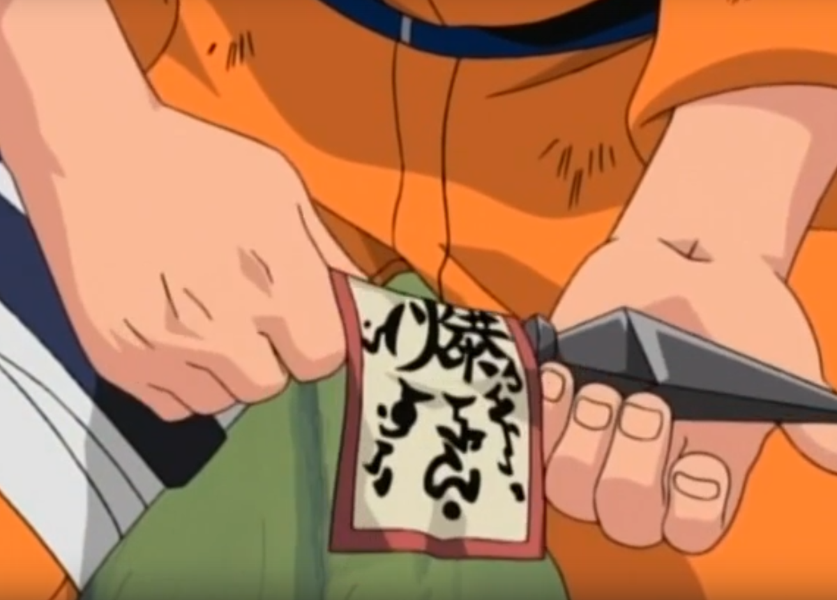 Прежде, чем перейти к сути, хочу отметить кадр, где мы видим, как Наруто достаёт из своего подсумка Взрывную Печать и наматывает её на рукоятку куная.