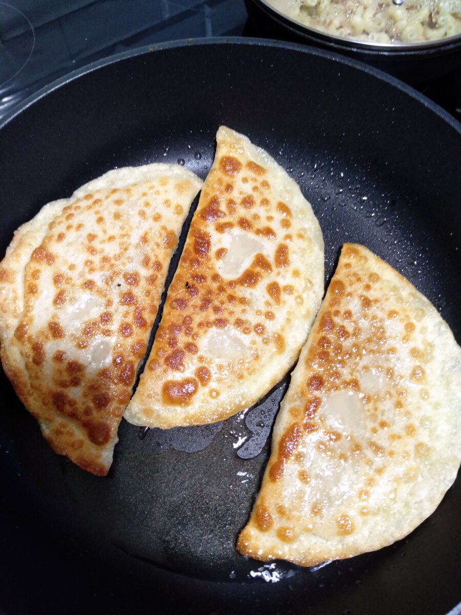 Делим тесто на небольшие части, и тонко раскатываем их в кружочки толщиной примерно 2 мм. Раскатываем тонко, но не до прозрачности. Оставляйте не меньше 1.5 см от края , добавляем начинку и складываем пополам. Закрепляем края при помощи вилки,или пальцами как вам удобнее.