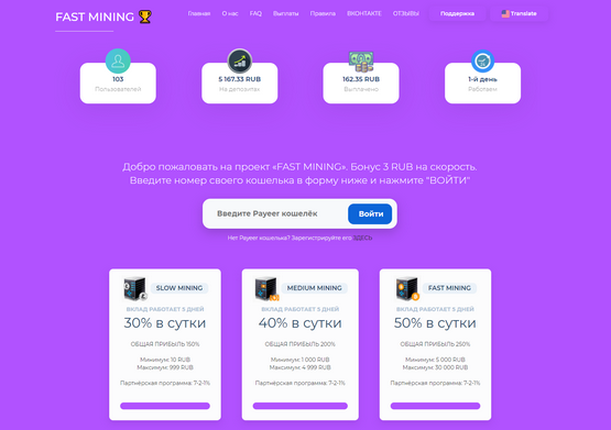 На мониторинге псевдомайнер по заработку рублей под названием "fast-mining", прибыльность от 150% до 250% за 5 дней, от 30% до 50% каждые сутки, начисление прибыли каждую секунду. Есть группа ВК. Достойный дизайн есть сертификат SSL. Выплаты инстант. Электронные платежные системы: Payeer.