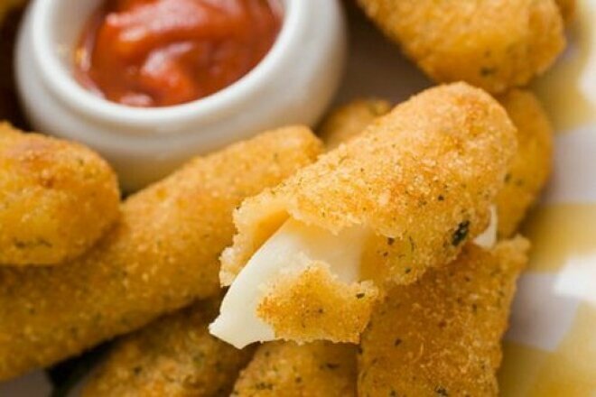 - Порезать сыр полосками, обвалять в муке, яйцах и сухариках панировочных.