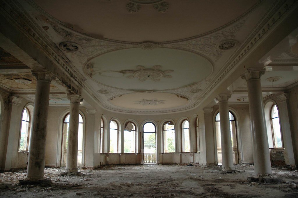 А вот это крыло заброшено. Возможно, здесь был кинотеатр или столовая: