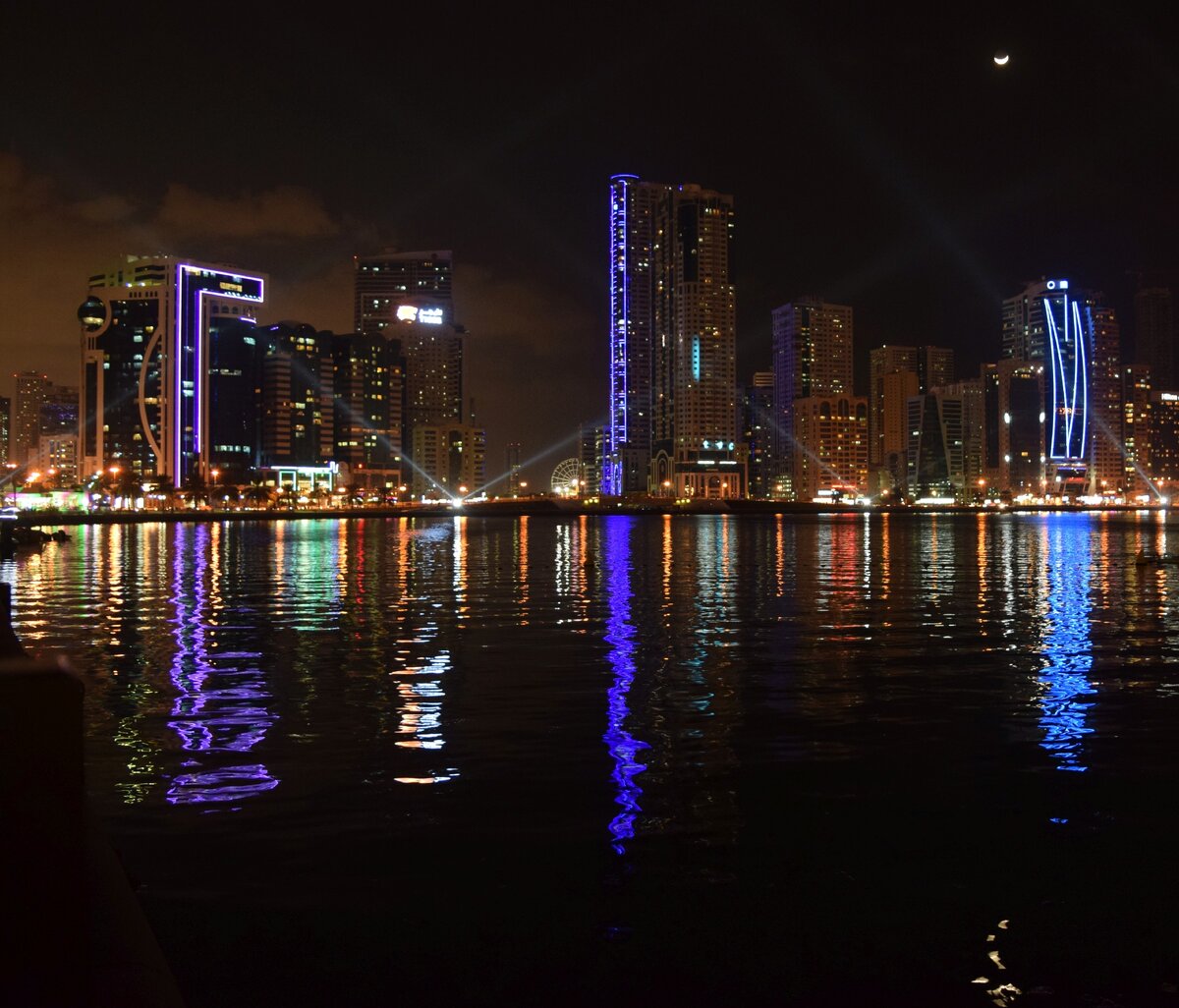 1. Одним из самых популярных мест для прогулок в Шардже является пешеходная зона Аль-Касба. Особенно красиво здесь в вечернее время, когда включают подсветку. Здесь же находится 60-ти метровое колесо обозрения "Око Эмиратов" с высоты которого открываются красивые виды.