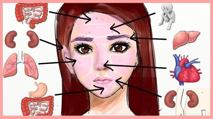 В области лба, носа и подбородка расположено обилие потовых и сальных желез – это является причиной повышенной жирности кожи. Считается, что прыщи покрывают лоб вследствие нарушений работы толстого и тонкого кишечника. На подбородке несовершенства обычно связаны с гормональными нарушениями и гинекологическими проблемами.
