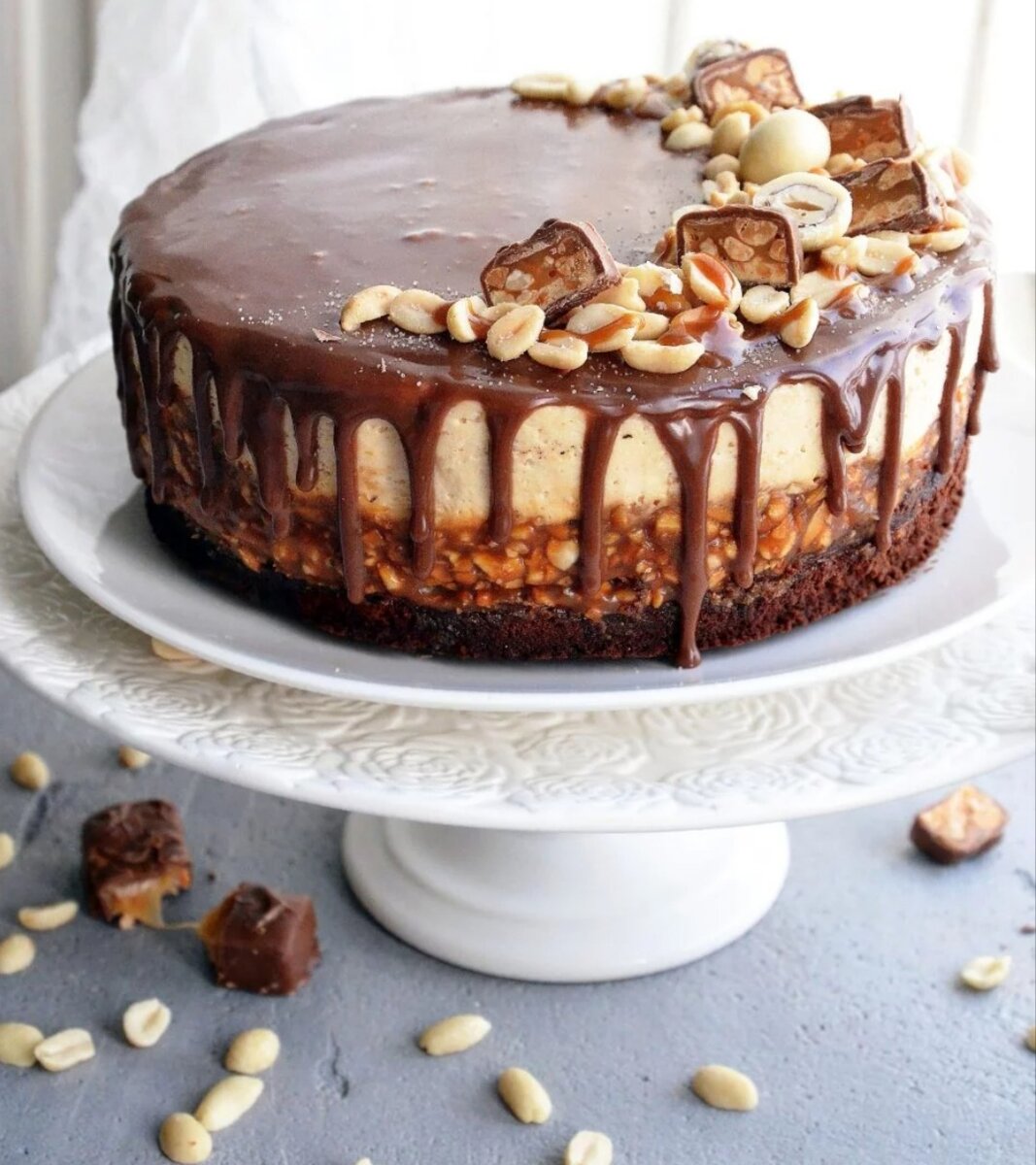 Растопить сливочное масло. Молотое печенье смешать с арахисовой крошкой и добавить горячее масло. Перемешать. Утрамбовать массу в разъемную форму и отправить в духовку на 10 мин при 170 С. Остудить.