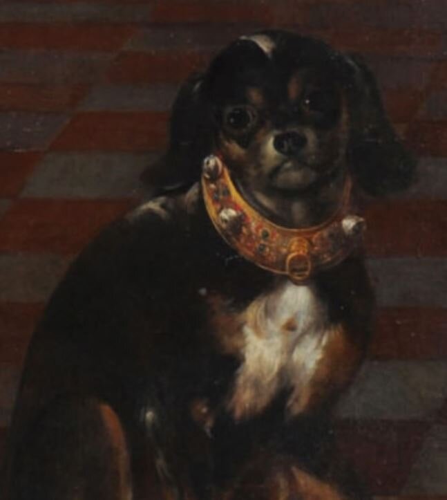 Нас, однако, волнует пёсик и его ошейник. Я думаю, он не приехал с ним из Японии, а скорей -- европейский подарок. Какой-то той-терьер, похоже, кинг-чарльз-спаниель (эта порода как раз была очень популярна среди аристократов того времени). На языке аллегорий собака означала верность (а в этом портрете этот язык применен, см. окошко).