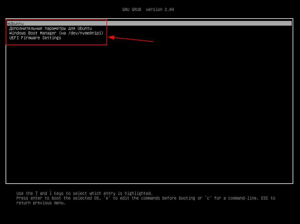 Данный скриншот делался на виртуальной машине. Но, на реальной машине все отличается не особо кардинальным образом. Вместо пункта: «Windows Boot Manager (на /dev /nvme 0n 1p 1)» вы будете видеть пункт, к примеру: «Windows 10 (на /dev /nvme 0n 1p 1)». Настраивать порядок загрузки будем в Ubuntu , поэтому загружаемся в неё.