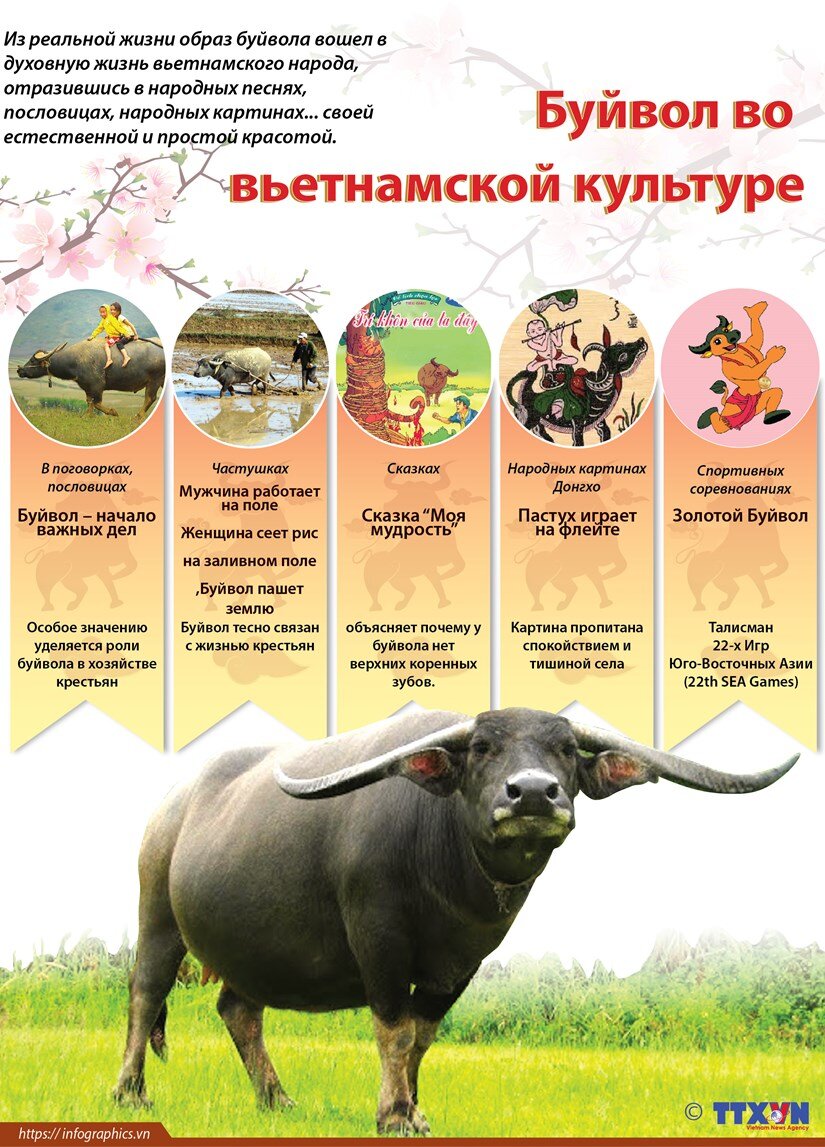 Из реальной жизни образ буйвола вошел в духовную жизнь вьетнамского народа, отразившись в народных песнях, пословицах, народных картинах... своей естественной и простой красотой.