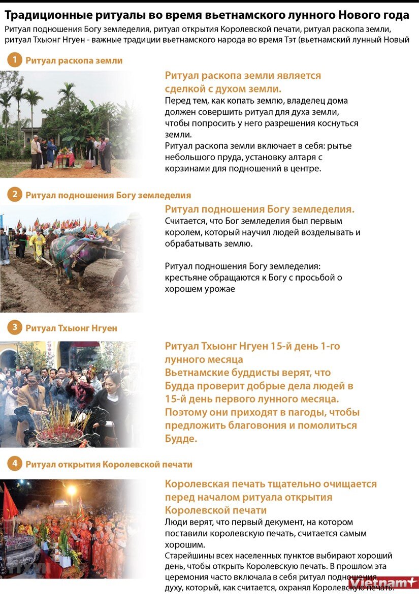 Ритуал подношения Богу земледелия, ритуал открытия Королевской печати, ритуал раскопа земли, ритуал Тхыонг Нгуен - важные традиции вьетнамского народа во время Тэт (вьетнамский лунный Новый год).