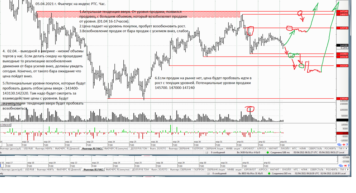 Здравствуйте друзья! Как дела? Как торги? Надеюсь всё хорошо! По идее мы сейчас стоим на перепутье. С одной стороны у нас рынок формировал тенденцию (часовую волну вверх), в этой волне цена дорасла до сильных уровней продаж, от которых довольно бодро пошли продажи, и 01 апреля в 16-17 чсасов мы увидели апогей так сказать продаж, большие усилие вниз с большим объемом. Цена при этом стукнула в уровень покупок, и уровень начал давать отбой цены вверх. Естественно при возврате цены в бар-усилие, от такого рыночного действия основное ожидание, что будет аналогичное возобновляющее движение, т.е в данном случае вниз. Но, 2 апреля в Америке был выходной, торги у нас были вялыми и не объемными, но тем не менее рынок пробовал порасти, а возобновления продаж от усилия вниз были очень слабыми. Можно было бы сказать что продавца тут нет, и похоже что цена пойдет на пробой вверх, если бы были в этот день нормальные торги. Да, слабость продаж видна, но я бы дал ещё продавцу день что бы проявить себя. Соответсвенно сегодня хотелось бы увидет как пойдет рынок, если продавец на уровне есть, то увидим возобновляющее движение вниз. Потенциальные уровни покупок которые могут давать попытку отбоя цены вверх - 143400-143130,142320. При этом цена попадает в уровни покупок волны вверх и по идее, где то с этих уровней может начаться возобновляющее движение вверх, с целью пойти на перехай к 147000-147200. Вобщем надо будет смотреть как цена будет взаимодействовать с уровнями покупки, пойдет на их пробой или увидим на них манипуляции. Если же продавца не будет и пойдем сразу вверх, то смотрим как цена отрабатывает уровень 145700, и я больше от него ждал бы слабого возобновления продаж и пробой который унесет цену на перехай.