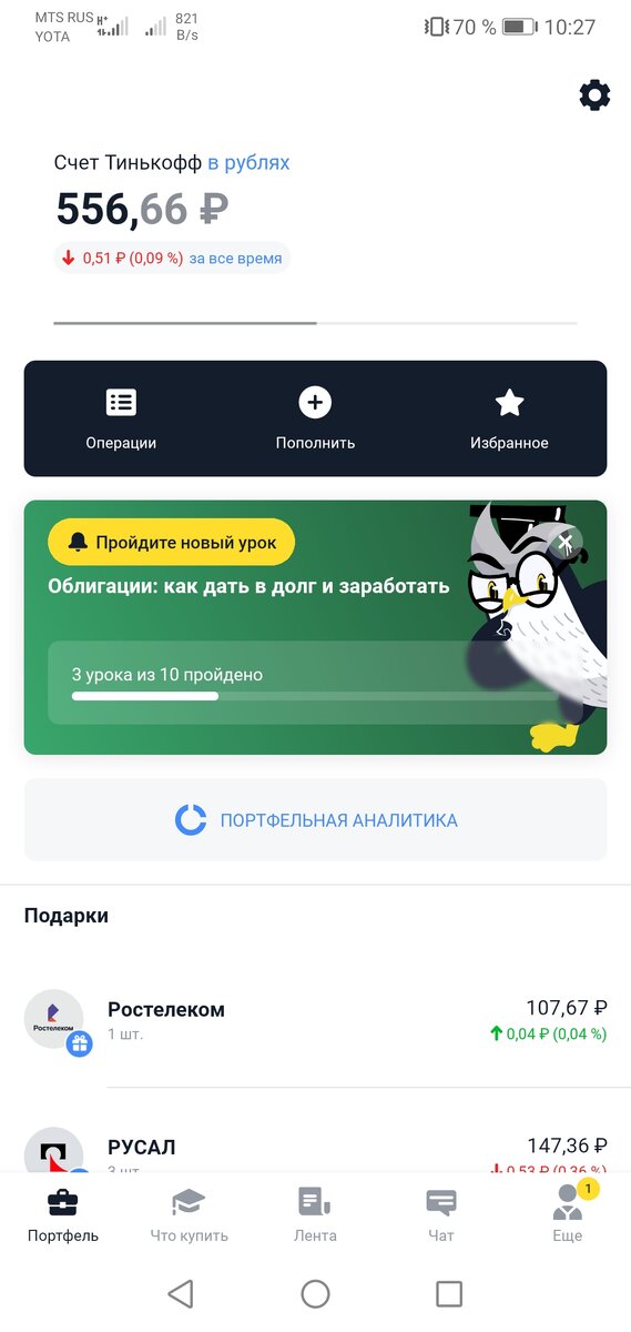 На данный момент мои инвестиции и портфель, это кошачьи слезы, но я рада что начала, и осознанно подошла к этому шагу, изучив кучу информации и посмотрев полезные видео