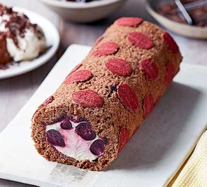 Шаг 4 Выньте из духовки, дайте остыть, пока не остынет достаточно, чтобы справиться, затем аккуратно сверните губку, пока она еще теплая (держа пергамент для выпечки прикрепленным). Оставить полностью остывать в свернутом виде. Размотайте губку и намажьте варенье изнутри. Работая быстро, разверните мороженое и положите его поверх варенья. Сверните вокруг него торт.