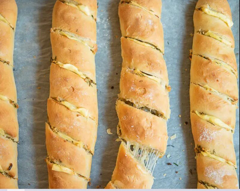 В этом посте вы найдете основной рецепт пшеничных багетов. Кроме того, вы можете заправить их чесночным маслом с добавлением измельченного укропа и кусочками желтого сыра. Для этого лучше всего подойдет моцарелла, так как при запекании она хорошо тянется.